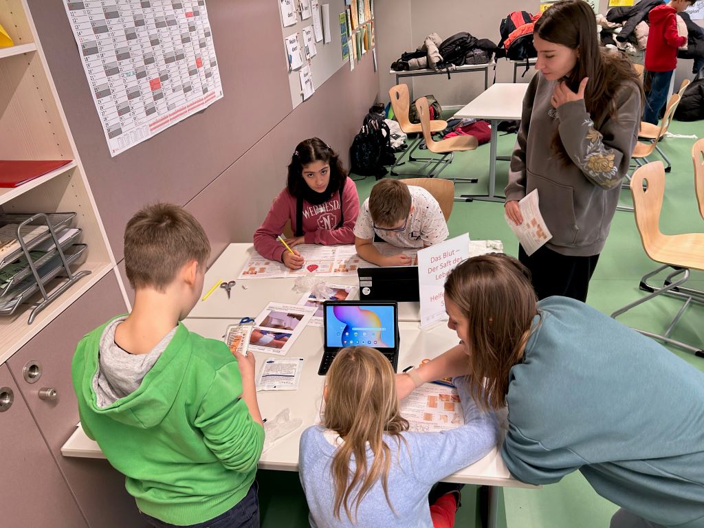 Am Freitag, den 21.11.2025 wurden die Schülerinnen und Schüler der Klasse 5a an einem Workshopvormittag zu ErsthelferInnen. In einem gemeinsamen BNE-Kooperationsprojekt zwischen Klassenlehrerin Maria Brunner, den Schulsanitätern, dem MINT-Netzwerk Donau-Baar-Heuberg sowie dem Schülerforschungszentrum Tuttlingen mit Frau Kaltenbach erfuhren die Kinder in einem ersten theoretischen Teil, warum Helfen im Notfall wichtig ist, welche Bedeutung eine Rettungsdecke hat und wie man sich bei einem Unfall richtig verhält.