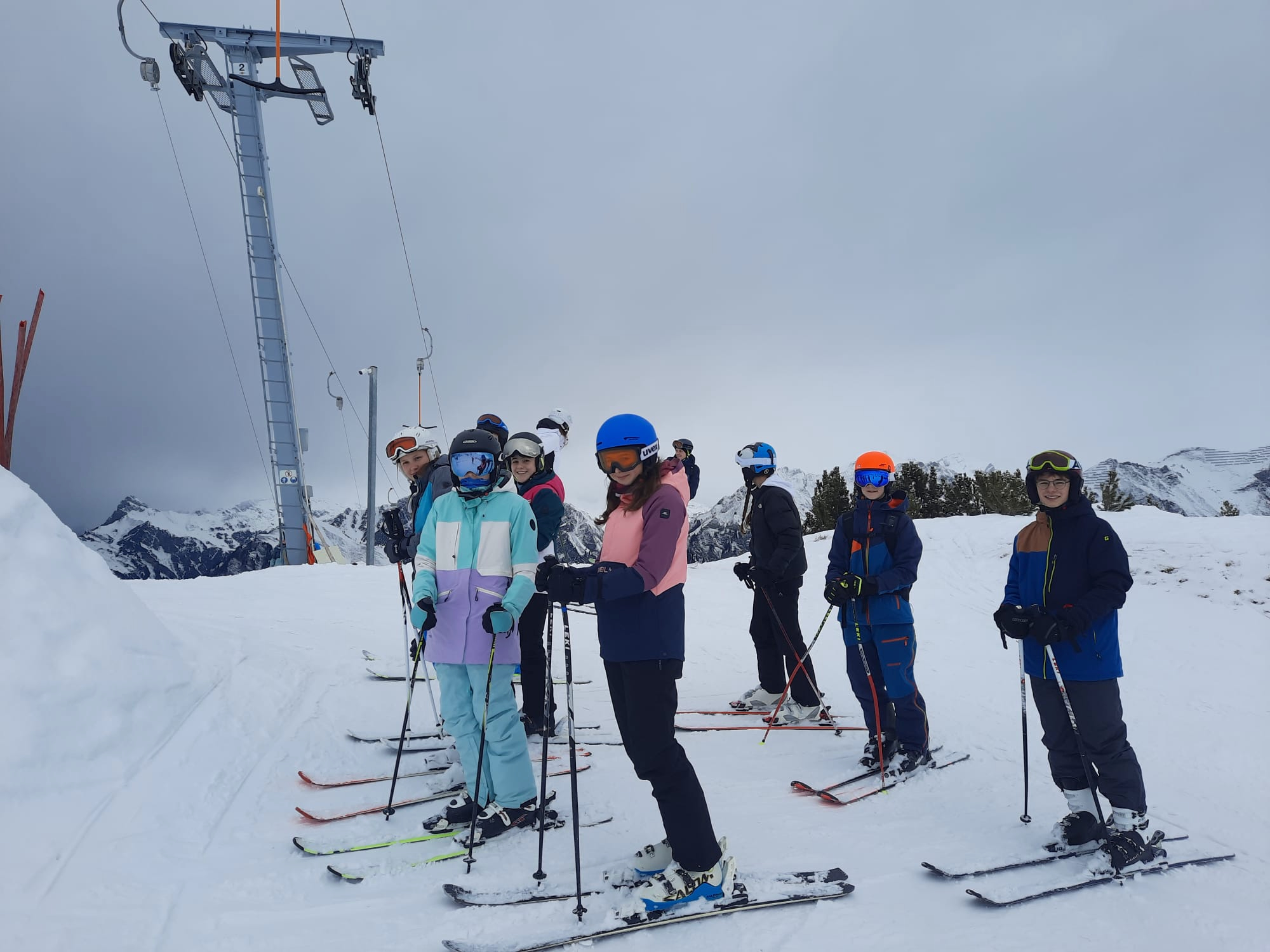Auch wenn sich das Wetter eher winterlich-trüb zeigte, waren die Bedingungen auf den Pisten insgesamt gut. Die Abfahrten waren gut präpariert und Wartezeiten an den Liften gab es keine. Nach der Ankunft wurden die Schülerinnen und Schüler in kleinere Gruppen eingeteilt, die jeweils von einer Lehrkraft oder einem ausgebildeten Schüler-Skimentor begleitet wurden. So war eine gute Betreuung und ein sicheres Miteinander auf der Piste gewährleistet.