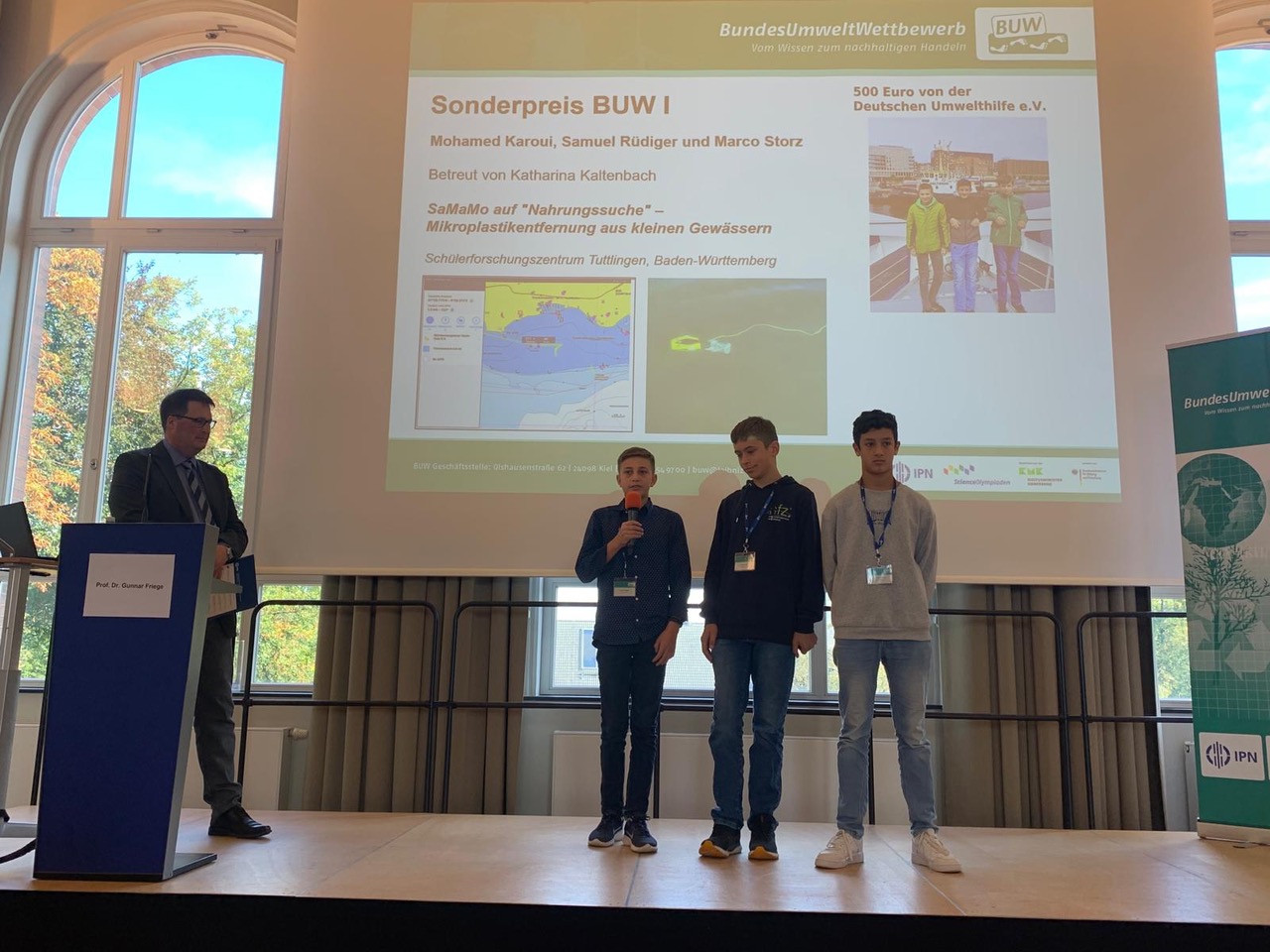 Nach ihrem Einzug ins Bundesfinale des Bundesumweltwettbewerbs und der erfolgreichen Präsentation ihrer Arbeit zur Beseitigung von Mikroplastik mithilfe einer Unterwasserdrohne in kleinen Fließgewässern durften Mohamed Karoui und Samuel Rüdiger (beide Klasse 8) mit ihrem Teampartner am Wochenende des 28. und 29. Septembers 2024 zur Preisverleihung des Wettbewerbs nach Hamburg fahren. Die Spannung war bis zuletzt groß. Am Ende gewannen die drei Nachwuchsforscher den bundesweiten Sonderpreis in der Altersklasse bis 16 Jahre und damit die zweithöchste Preiskategorie, die mit 500€ dotiert ist. Diesen Preis erhalten Arbeiten, die gemäß dem BUW-Motto „Vom Wissen zum nachhaltigen Handeln“ sowohl hinsichtlich der wissenschaftlichen Komponente „Wissen“ oder der Umsetzungs- bzw. Anwendungskomponente „Handeln“ als auch der allgemeinen Leistungskriterien als gut bis sehr gut bewertet werden. Betreut wurden die drei am Schülerforschungszentrum Tuttlingen von Katharina Kaltenbach.