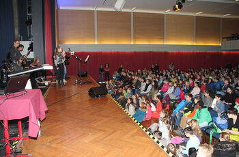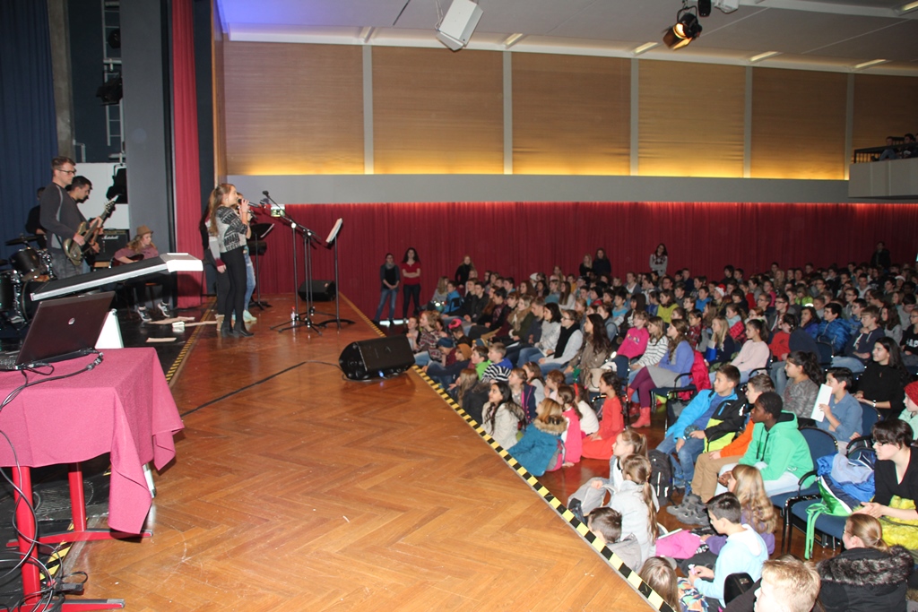 Die Schüler und Schülerinnen sitzen klassenweise in der Aula.